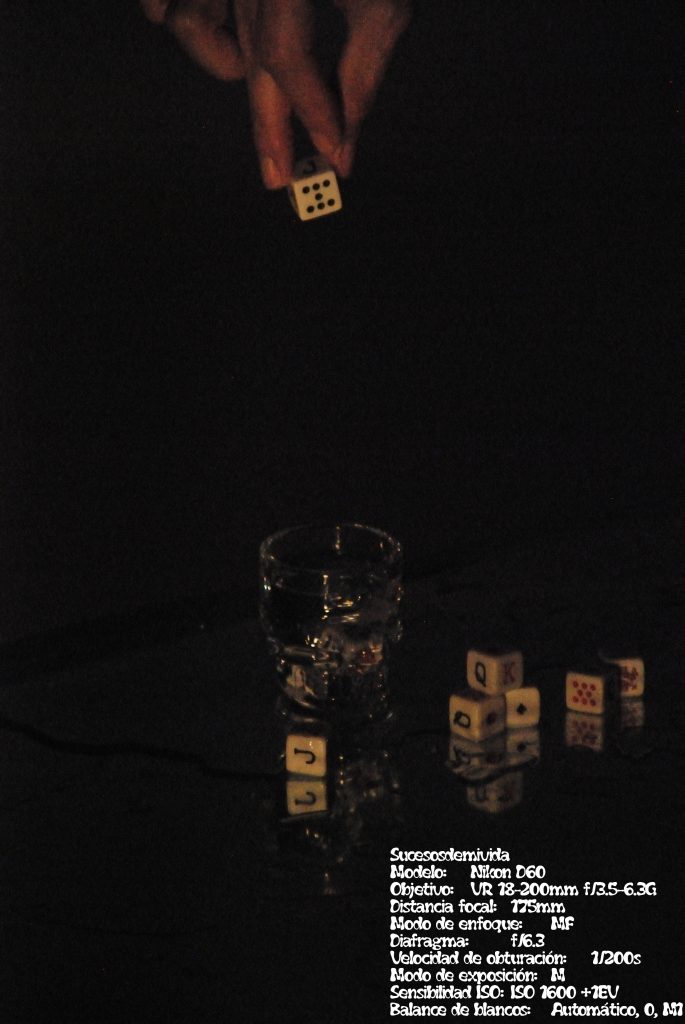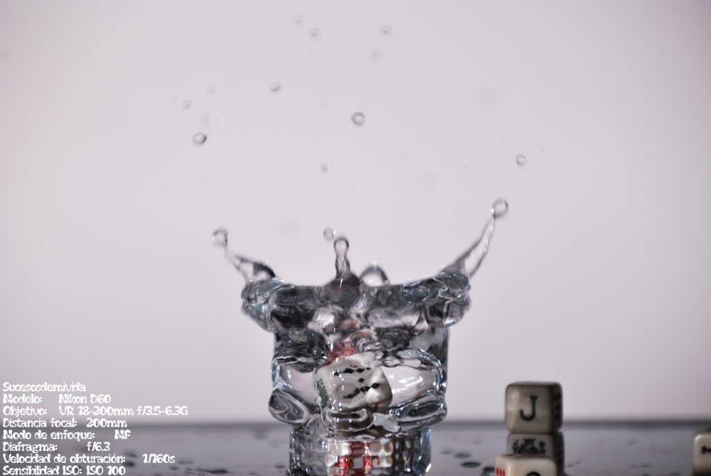 No solo era importante la sincronización entre cámara y flash, sino que el componente humano era tremendamente importante. Teníamos que capturar el momento en el cual el objeto ( en esta caso un dado) chocaba con el agua. Este dando era soltado por otro compañero a la voz de 3.