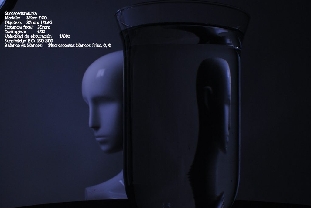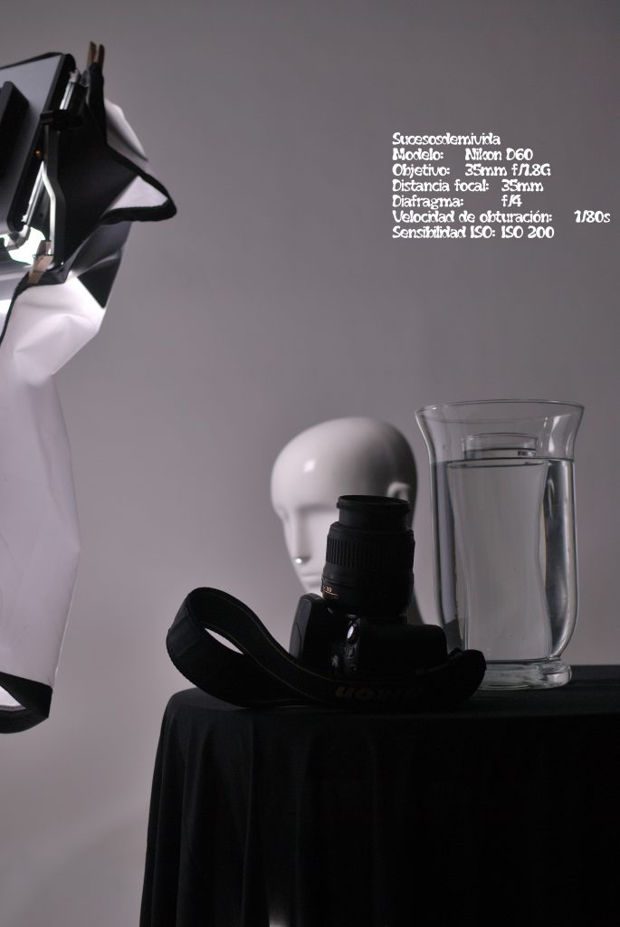 A nivel de espacio, usamos un fondo blanco y dos paneles formando un trapecio cuyo largo corto estaba más cercano a nuestra posición y el lado más largo al fondo. Sobre una mesa, con una tela negra, un jarrón con el agua ( en el que luego probamos introduciendo otro jarrón dentro) y la parte de arriba de un maniquí por detrás del jarrón. El panel de la derecha en negro mientras que el panel de la izquierda, blanco para que nos aportara más luz, y generase menos reflejos sobre el maniquí y el agua.