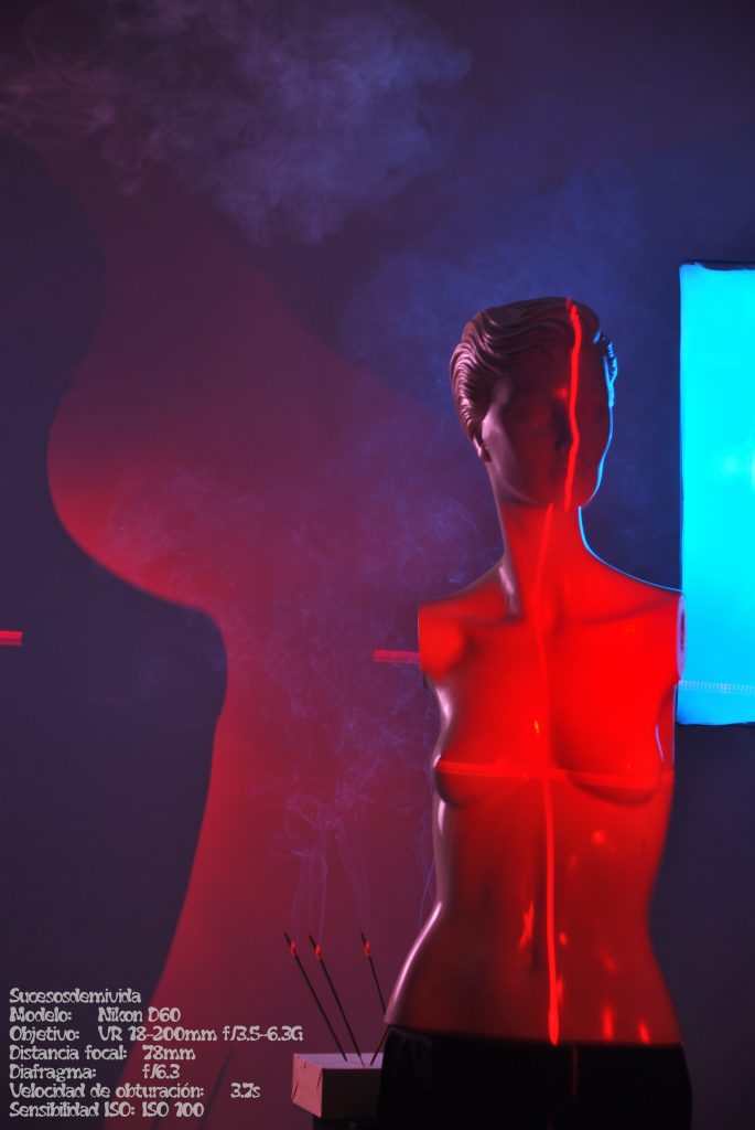 Respecto a las luces, pusimos dos flashes uno en cada equina de la U, apuntando al maniquí, ambos con un difusor y un papel de color para emular los led RGB.