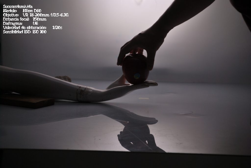 A nivel de luz, las fotos se hicieron con la luz de la habitación apagada, y dos puntos de luz, uno debajo de la mesa aunque en esta ocasión en una posición más elevada que en la clase anterior apuntando al fondo blanco y otro de manera lateral en la parte izquierda, en la que la pared era negra. Es decir, quedaba a un lado de los alumnos apuntando de manera diagonal la escena. Con este punto de luz que iluminaba la escena es con el que más probamos distintas posiciones para tratar de buscar la mejor iluminación y la eliminación de reflejos no deseados.
