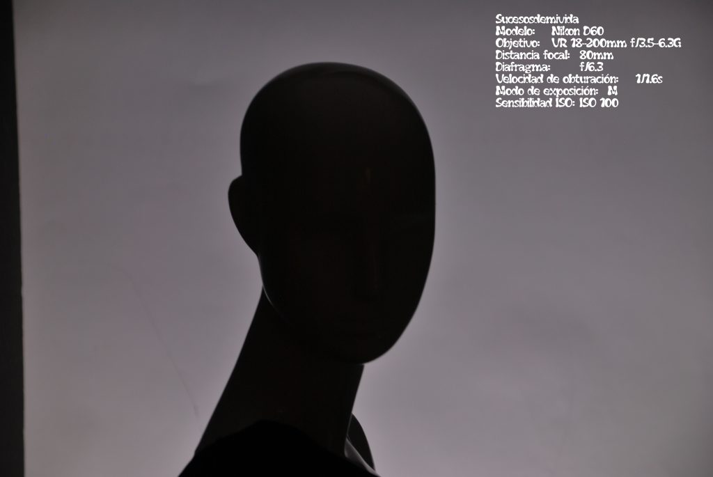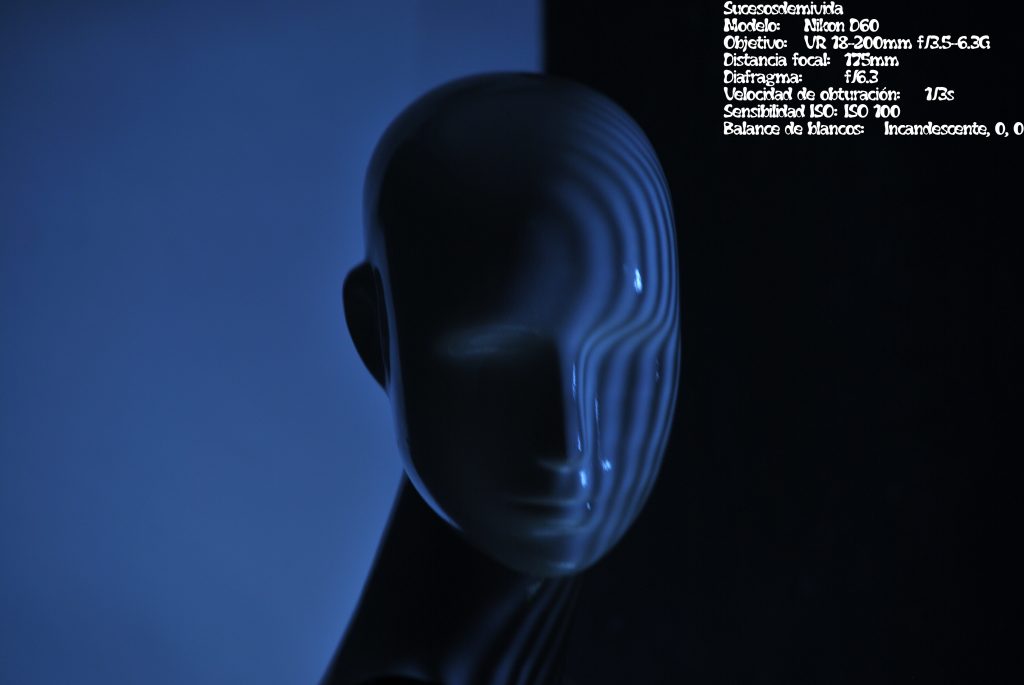 El caso es que precisamente esa oscuridad, y esos colores obtenidos en parte por el balance de blancos usados es de lo que más me gusta. Una imagen dividida en dos iluminación tenue a la izquierda y oscuridad a la derecha separados por la misma oscuridad que tiene el mar cuando se observa desde arriba en mar abierto. Además, en la zona más oscura de la foto aparece la figura del maniquí como si nos recordase que la luz de alguien, no tiene porque desaparecer en la oscuridad e incluso parece enfrentarse a ella.