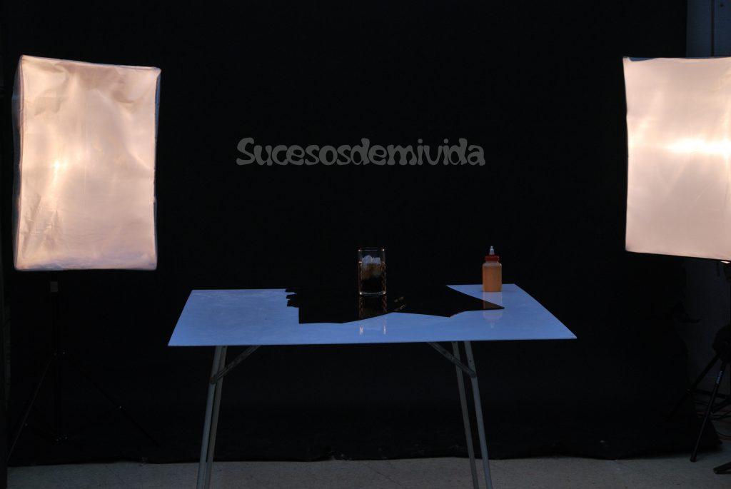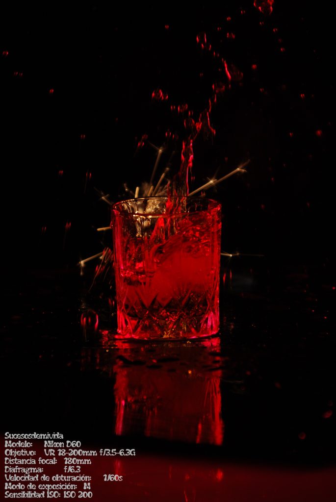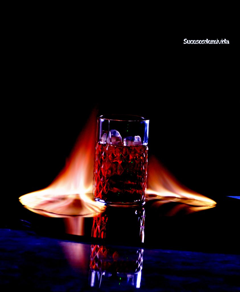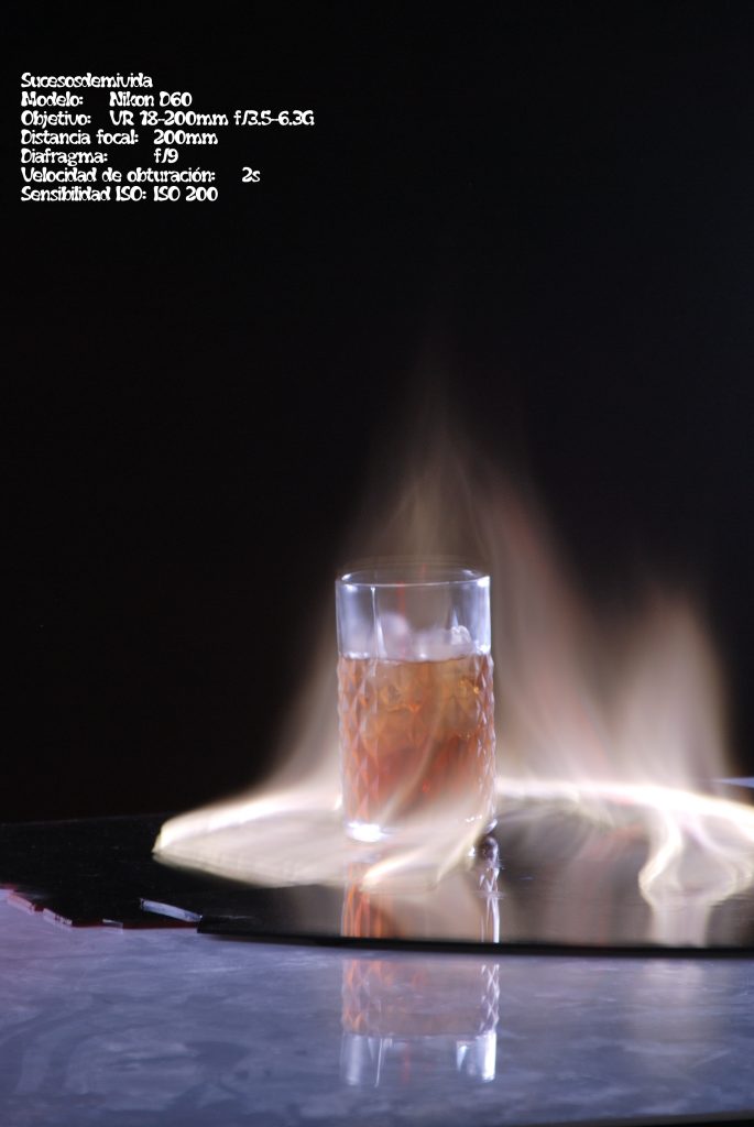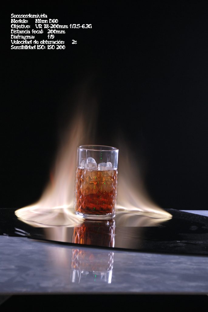 Respecto a las luces, fuimos probando distintas opciones a lo largo de la sesión. Básicamente usamos 2 flashes sincronizados, situados en las esquinas y que tratábamos de hacer saltan manualmente al tiempo que otro compañero tiraba los hielos para provocar las salpicaduras y otro realizaba la fotografía. Y todo ello, justo después que otra persona encendiera el liquido inflamable.